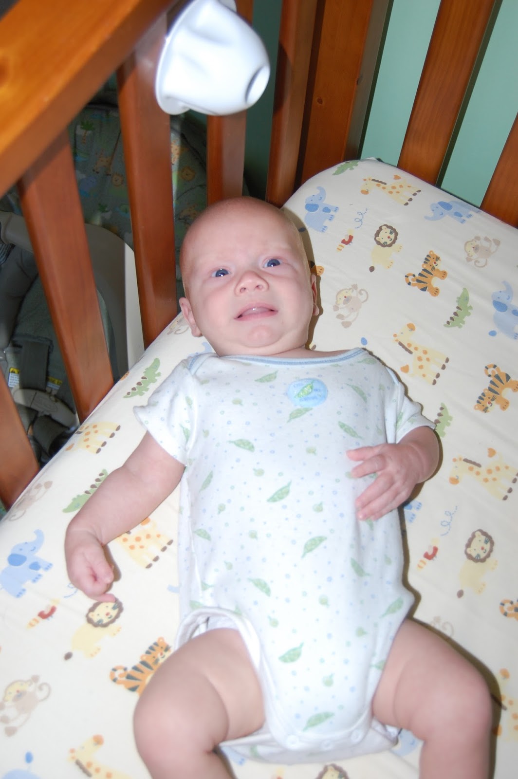Right after turning two months old, he started sleeping through the night! He's had a little sleep regression lately, which is expected at three months. He usually wakes somewhere around 3am and then again around 6 or 7am. He still sleeps on his belly in his crib. We removed the bumper on his crib because it was making me nervous so he occasionally gets his legs or arms stuck in between the slats.